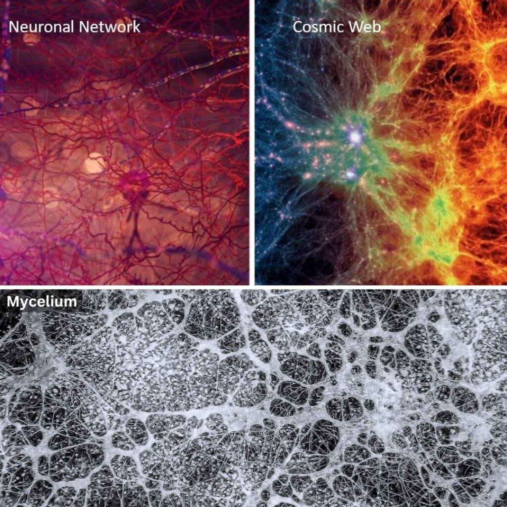 Whilst researching proof of interconnectedness, I could not help but notice the uncanny visual similarity between the brain’s neural networks, underground mycelium networks found beneath forests, and what Scientists refer to as the Cosmic Web found in space. Depictions of how data networks share information across the globe also carry a haunting resemblance.