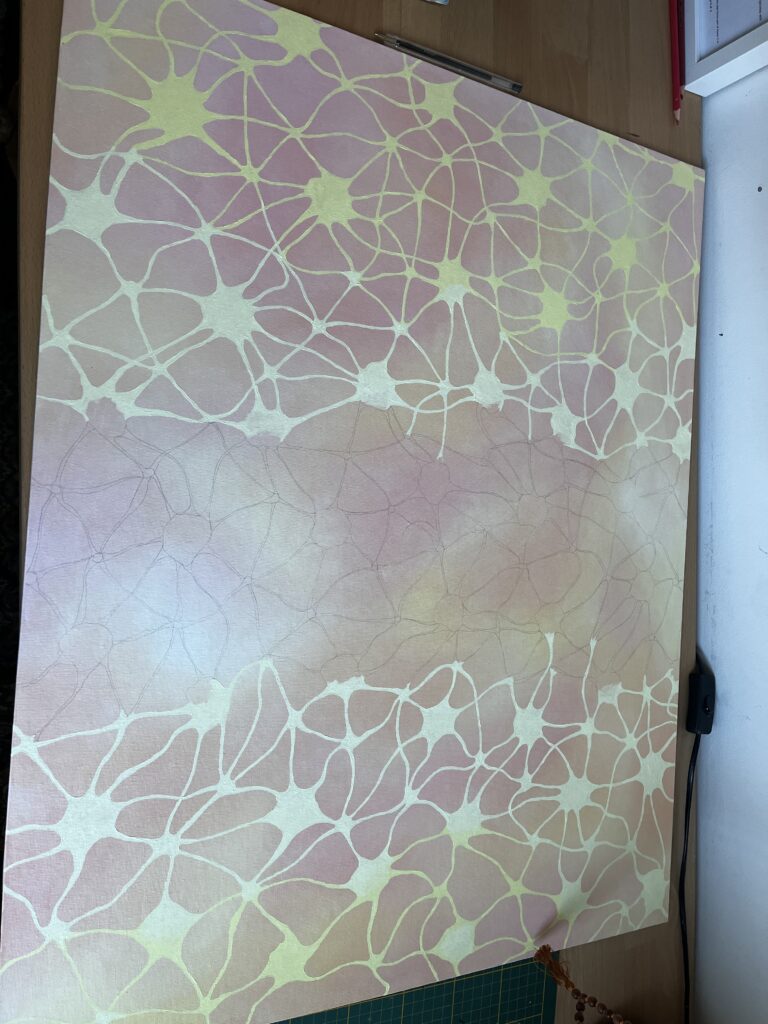 I have indulged myself once again in a state of not-knowing. I initially started with the colourful background, not knowing what I wanted to do with this canvas other than that I am drawn to gentle pastel colours at the moment. Then I decided to doodle-draw my version of synaptic connections in the brain. Once I ran out of one colour, I simply mixed another, not being too mindful of even colour-matching.